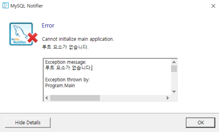 이는 MySQL 의 notifier config 파일이 손상되었을 경우 발생하는 것으로 알려져 있습니다.